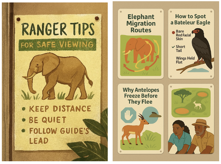 One morning, Adiza arrived early. She didn’t join the baobab tree huddle. She stood by the front desk, reviewing the briefing sheet. Then she walked to the infographic board and adjusted the placement of a new poster: “Ranger Tips for Safe Viewing.”